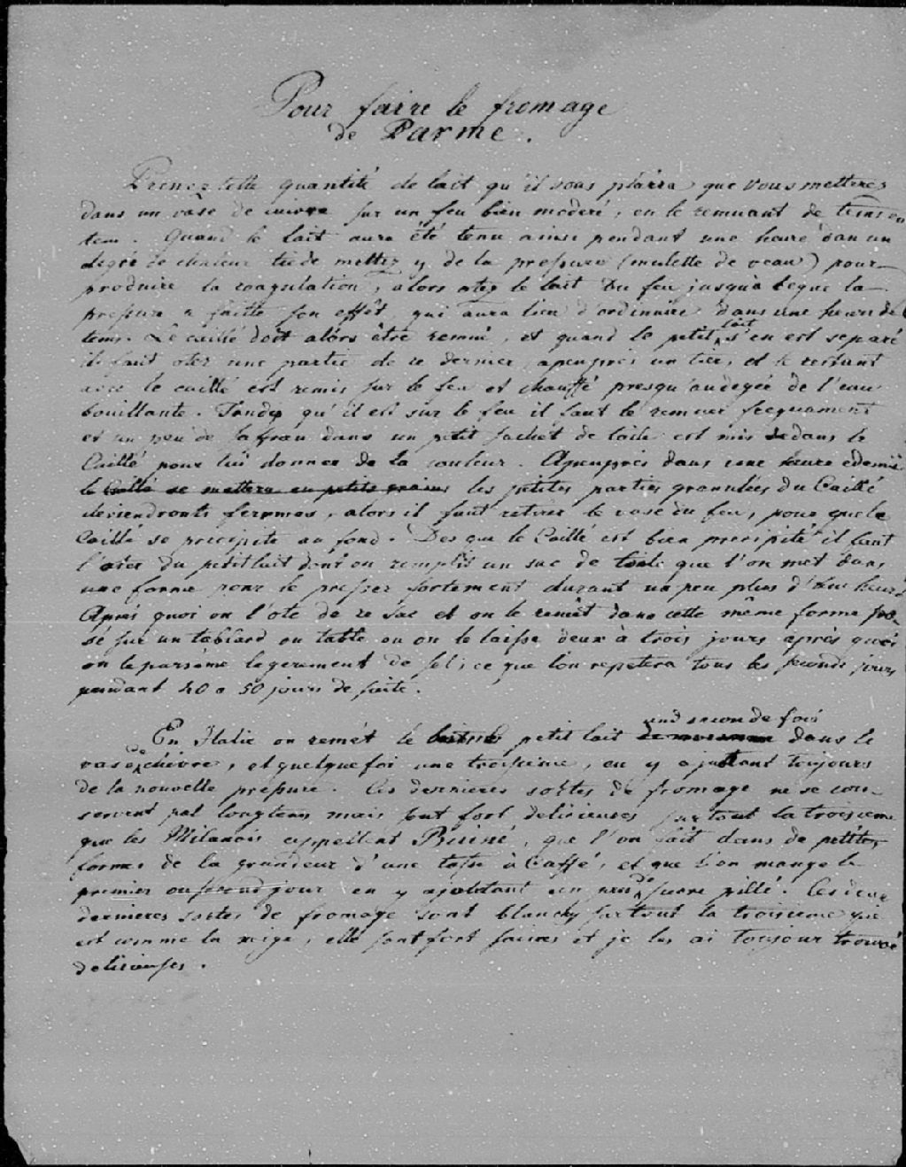 Procédé de fabrication du fromage de Parme, [Vers 1800], Archives nationales à Montréal, Collection des petits fonds et collections d'archives manuscrites d'origine privée, (06M,P1000,D187).