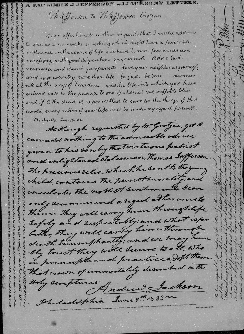 Andrew Jackson, 1823-1833, Archives nationales à Montréal, Collection des petits fonds et collections d'archives manuscrites d'origine privée, (06M,P1000,D236).