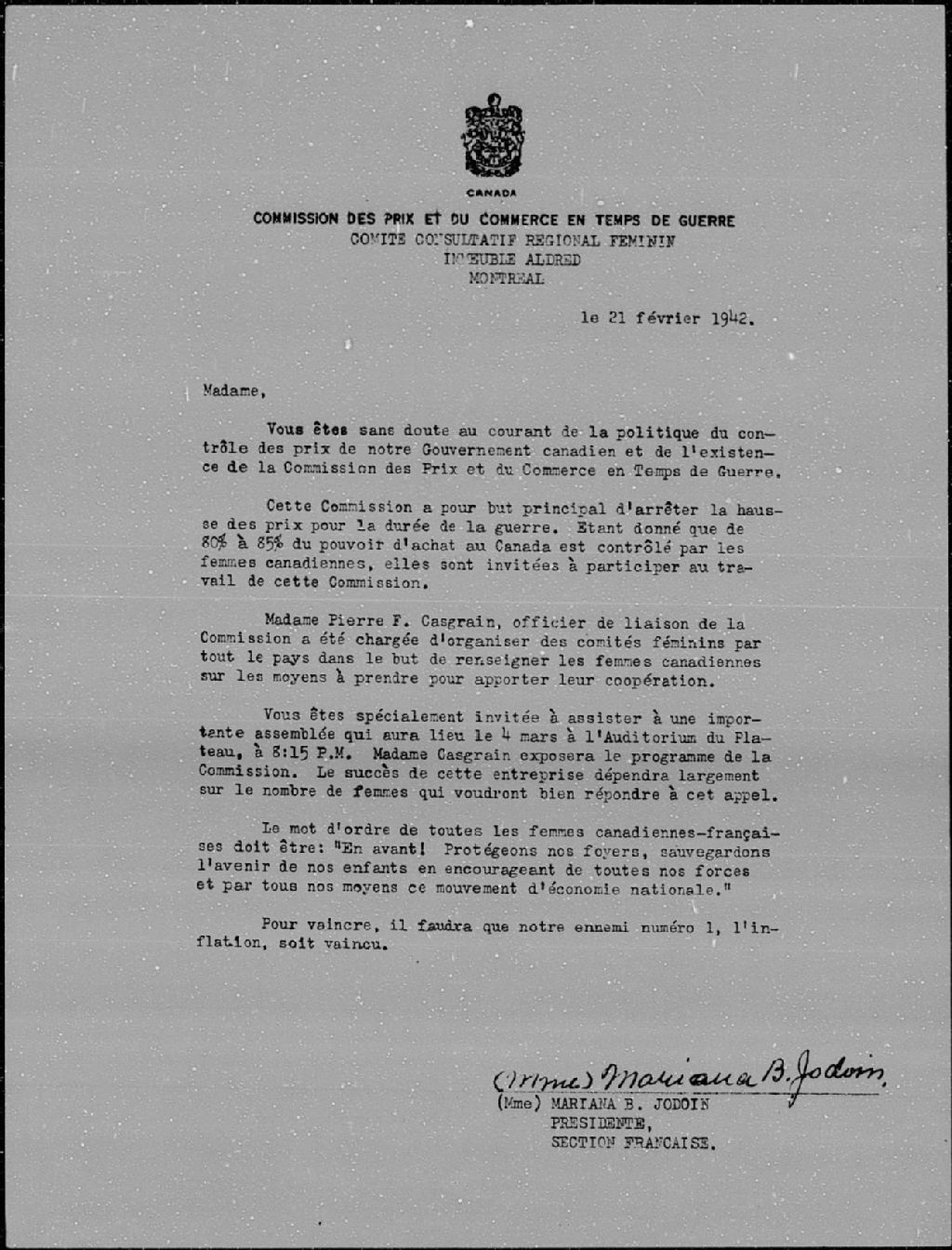 Circulaire de la "Commission des prix et du commerce en temps de guerre" envoyée par madame Mariana B. Jodoin, présidente de la section française de la Commission, Montréal, 21 février 1942