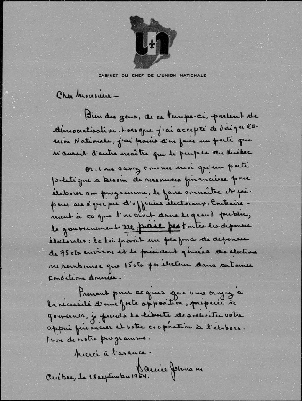 Daniel Johnson, 1964, Archives nationales à Montréal, Collection des petits fonds et collections d'archives manuscrites d'origine privée, (06M,P1000,D238).