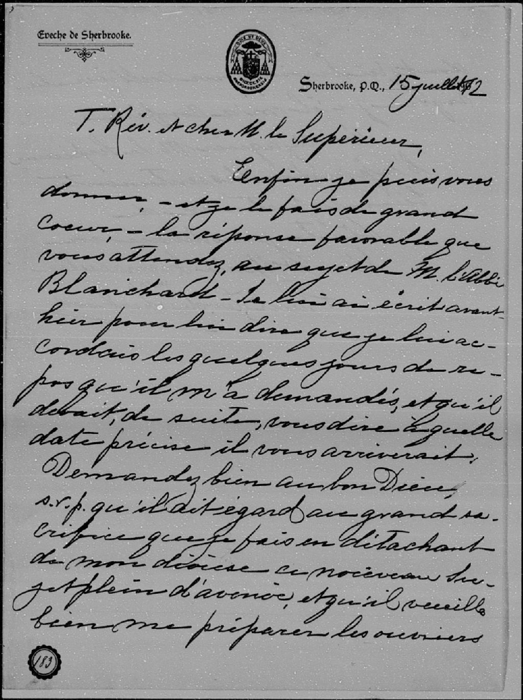 - Lettre de Monseigneur Paul Larocque, évêque de Sherbrooke, au supérieur du Séminaire Saint-Sulpice, Sherbrooke, 15 juillet 1912