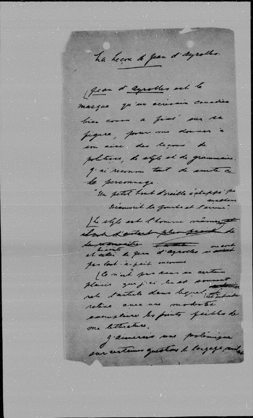 - Brouillon d'un article de Arthur Beauchesne intitulé "La leçon de Jean d'Ayrolles", dans lequel il rend hommage à l'écrivain et critique qui se cache sous ce nom de plume, 29 janvier 1902