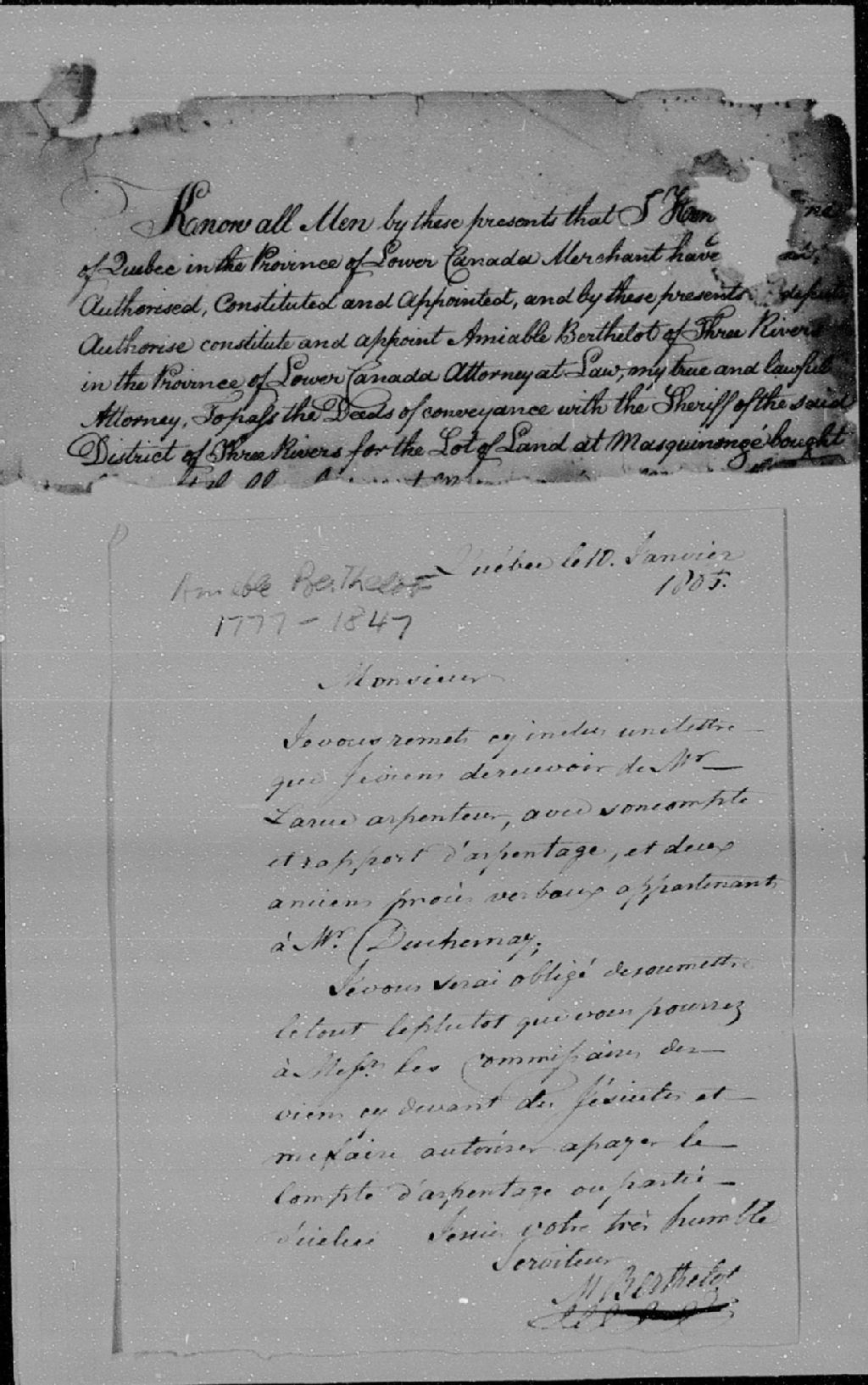 Fragment d'un document en anglais désignant Amable Berthelot comme représentant légal dans une transaction concernant une terre à Maskinongé, s.d.; lettre de Amable Berthelot au sujet de monsieur Larue, arpenteur, et de monsieur Duchesnay, Québec, 10 janvier 1805