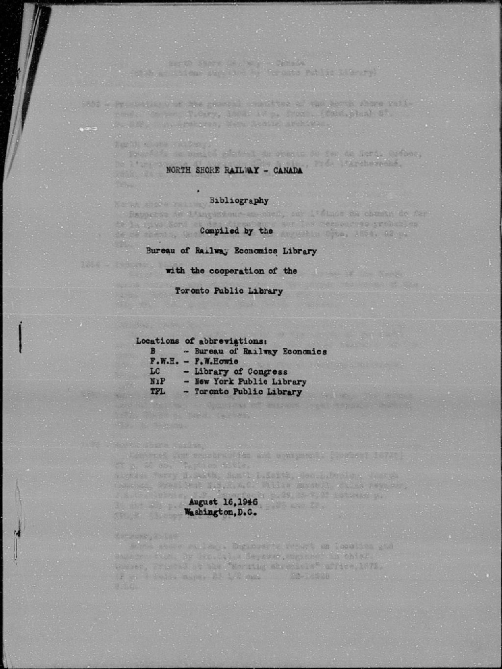 - Bibliographie recensant les ouvrages parus sur le système ferroviaire canadien de 1852 à 1884, Washington,D.C., 16 août 1946