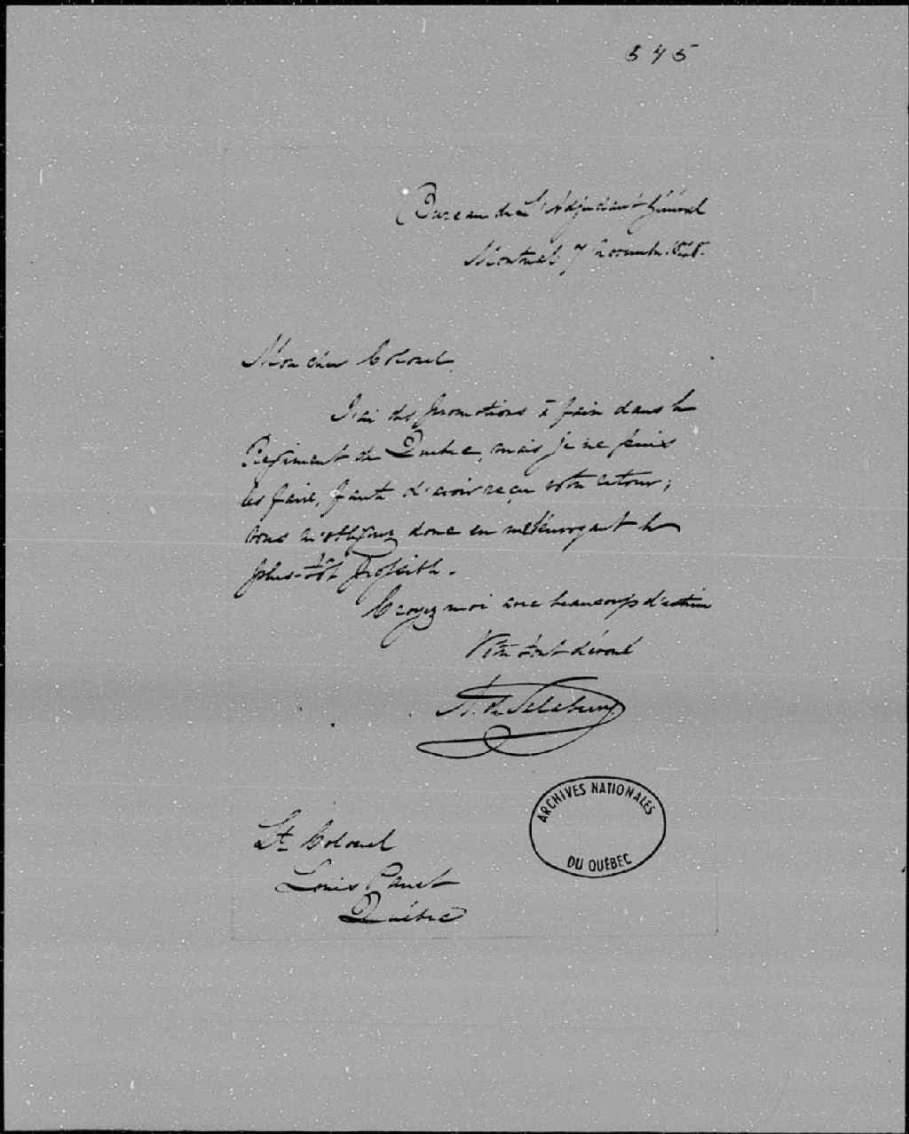 - Transaction et convention entre les héritiers de feu Monsieur Ogier, grand audiencier de France, 22 août 1736; documents divers sur les familles de Salaberry et Ogier, dont la correspondance, des testaments, des actes de décès et la photocopie d'une courte biographie de la famille de Salaberry, 1737-1818; lettre de Ignace-Michel-Louis-Antoine de Salaberry à son fils Charles-Michel de Salaberry concernant le combat de 1813; 6 novembre 1813. Photocopie d'une lettre de A. de Salaberry au lieutenant-colonel Louis Parent au sujet des promotions dans le Régiment de Québec, 7 novembre 1848