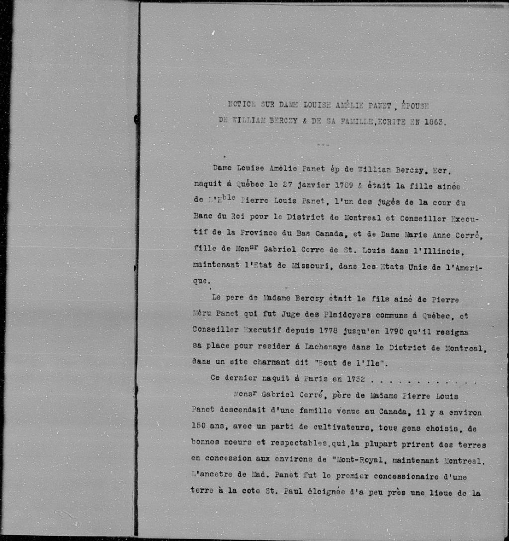 - Ce dossier comprend le document intitulé « Notice sur dame Louise Amélie Panet, épouse de William Berczy & de sa famille, écrite en 1863 »
