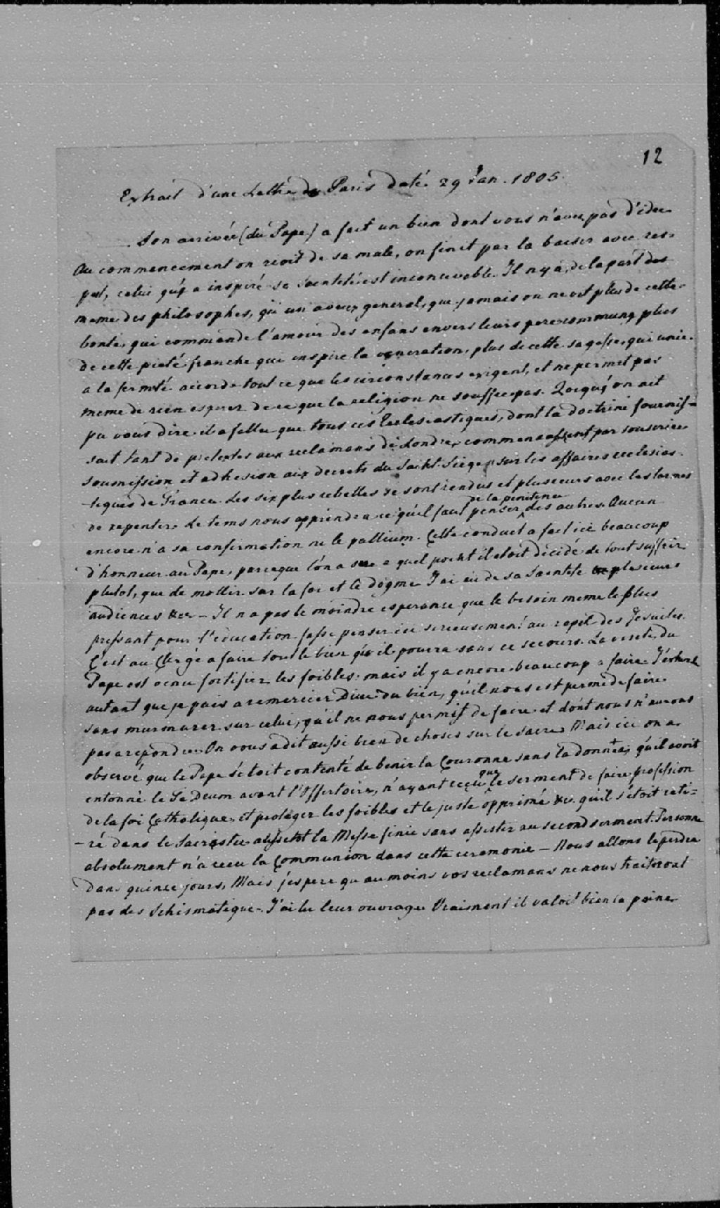 Lettre d'un des nonces de Paris au sujet de Sa Sainteté le Pape Pie VII et de sa conduite au sacre de Napoléon, Paris, 29 janvier 1805