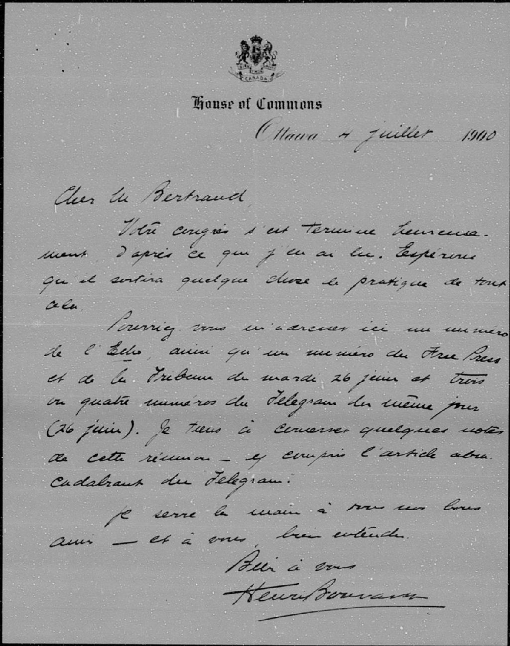 Correspondance entre l'administrateur officiel de la province du Manitoba, monsieur Bertrand, Sir Wilfrid Laurier et Henri Bourassa sur différents sujets, tels la question des livres bilingues dans les écoles publiques du Manitoba. Nous trouvons également dans cette collection de nombreux télégrammes codés et décodés, 1898-1900