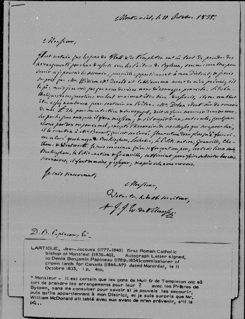 - Lettre de monseigneur Jean-Jacques Lartigue à Denis-Benjamin Papineau, Montréal, 11 octobre 1835