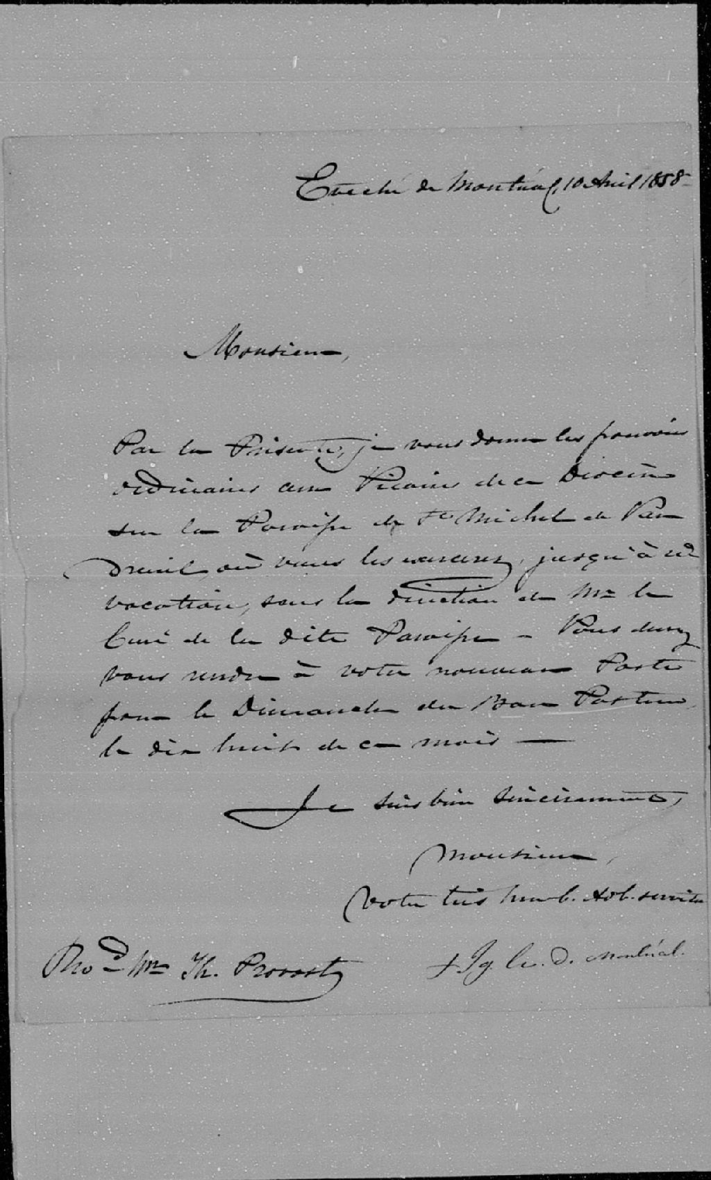 Lettre de Ignace Bourget à Th. Provost, Montréal, 10 avril 1858; document intitulé «Lettre pastorale de Monseigneur l'Évêque de Montréal, dénonçant Charles Chiniquy, prêtre comme apostat», Montréal, 4 février 1859