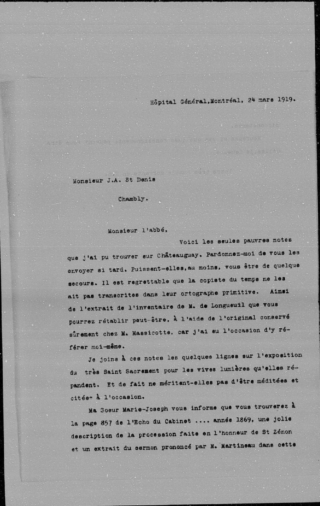 - Lettre dactylographiée de soeur Fauteuse à l'abbé J.-A. Saint-Denis, de Chambly, Montréal, 24 mars 1919; notes dactylographiées sur Châteauguay par l'abbé M. Mainville, s.d
