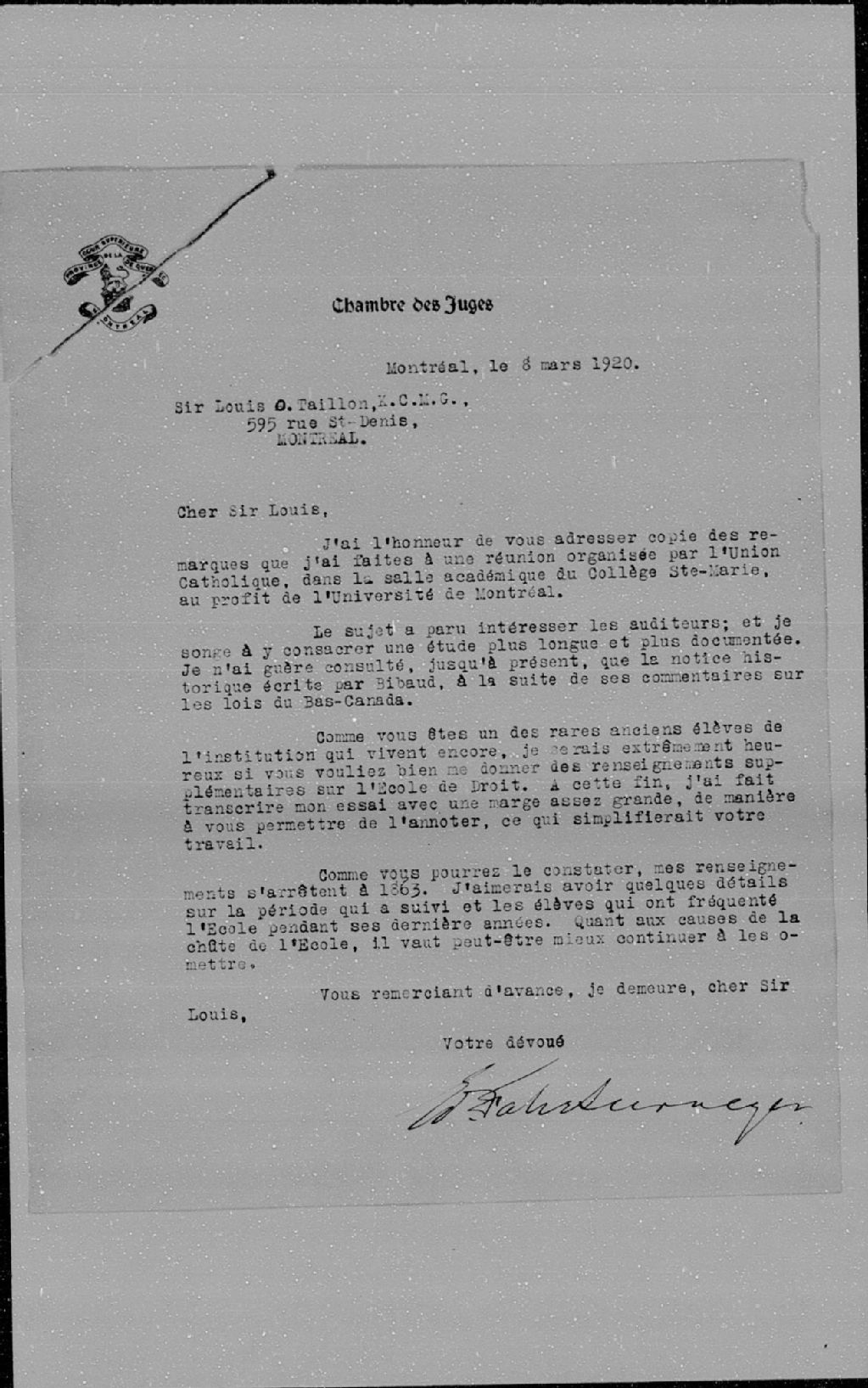 - Lettre de Édouard-Fabre Surveyer à Sir Louis-O. Taillon, Montréal, 8 mars 1920; conférence intitulée «Une école de droit à Montréal avant le code civil», 1920