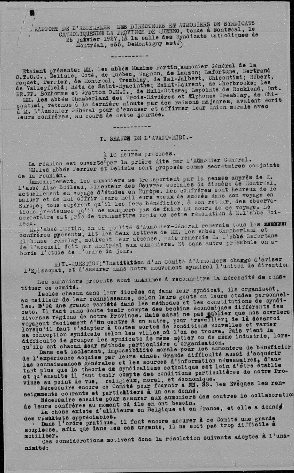 - Document intitulé «Rapport de l'Assemblée des directeurs et aumôniers de syndicats catholiques de la province de Québec», Montréal, 25 janvier 1927