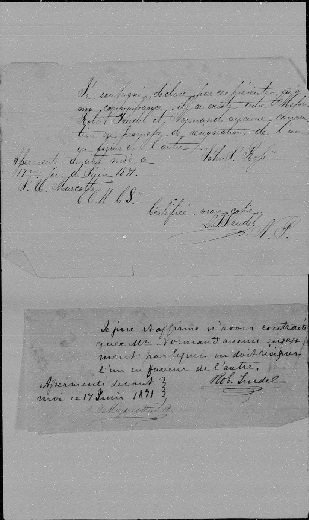 Déclaration de John Ross selon laquelle il n'existe aucune promesse de résignation entre Robert Trudel et monsieur Normand, 17 juin 1871; déclaration de Robert Trudel selon laquelle il n'y a aucun engagement entre lui et monsieur Normand, 17 juin 1871