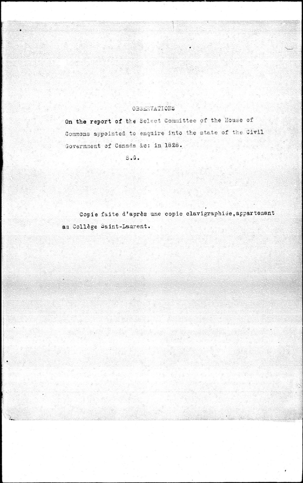 - Document intitulé «Observations on the Report of the Select Committee of the House of Commons Appointed to Enquire into the State of the Civil Government of Canada», 1828