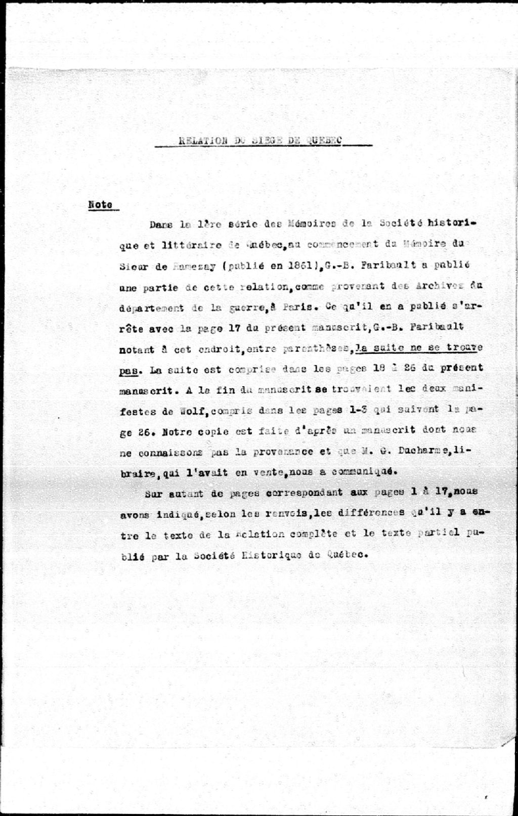 - Copie dactylographiée de la relation du siège de Québec et des deux manifestes du général Wolfe, affichés aux portes des églises de Beaumont, pour le premier, et de Saint-Henri, pour le second, en 1759; [a 1900]