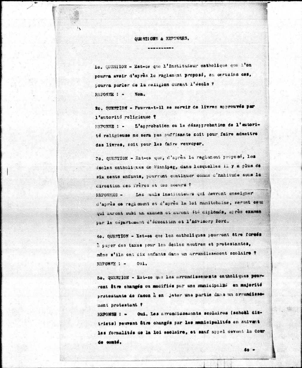 - Texte manuscrit en anglais relevant certains extraits du Public School Act voté par le Manitoba, 31 mars 1890; texte dactylographié présenté sous forme de questions et réponses touchant le problème de la religion et de la langue dans les écoles du Manitoba, s.d