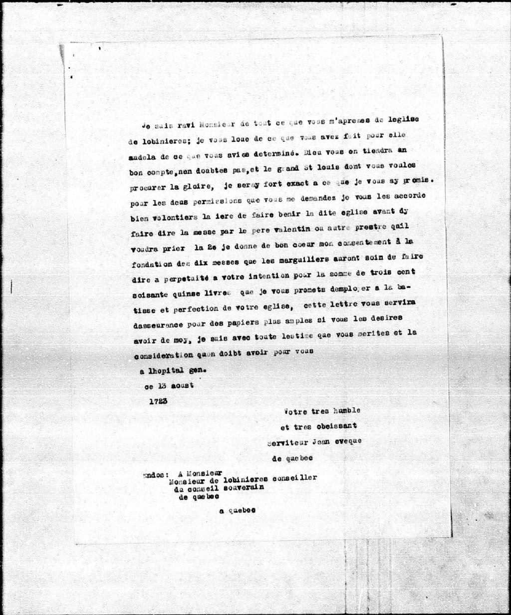 Copie dactylographiée d'une lettre de Jean, évêque de Québec, à Monsieur de Lotbinière, conseiller du Conseil souverain de Québec, concernant son accord à deux demandes du conseiller, 13 août 1723; copies dactylographiées de la correspondance entre Chartier de Lotbinière, monseigneur Jean-Octave Plessis, évêque de Québec, et Monsieur de la Chevrotière, concernant l'emplacement de la nouvelle église, 1er octobre 1810 - 19 avril 1815; lettre de Chartier de Lotbinière pour demander aux commissaires d'assumer à parts égales le paiement d'une armoire pour contenir les papiers de la commission, s.d