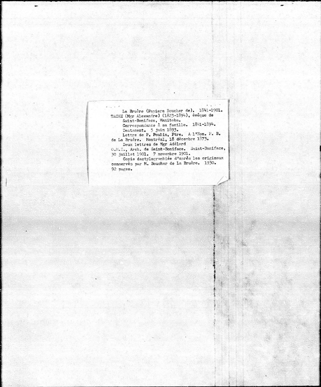 Lettres de Alexandre-Antonin Taché à sa famille, 3 octobre 1841 - 4 septembre 1875, 6 mars 1885 - 7 mai 1894; testament de Alexandre-Antonin Taché, archevêque de Saint-Boniface, Manitoba, 5 juin 1893; lettres de Monseigneur Adélard, archevêque de Saint-Boniface, à l'honorable Boucher de la Bruère, surintendant de l'Instruction publique, 30 juillet et 7 novembre 1901