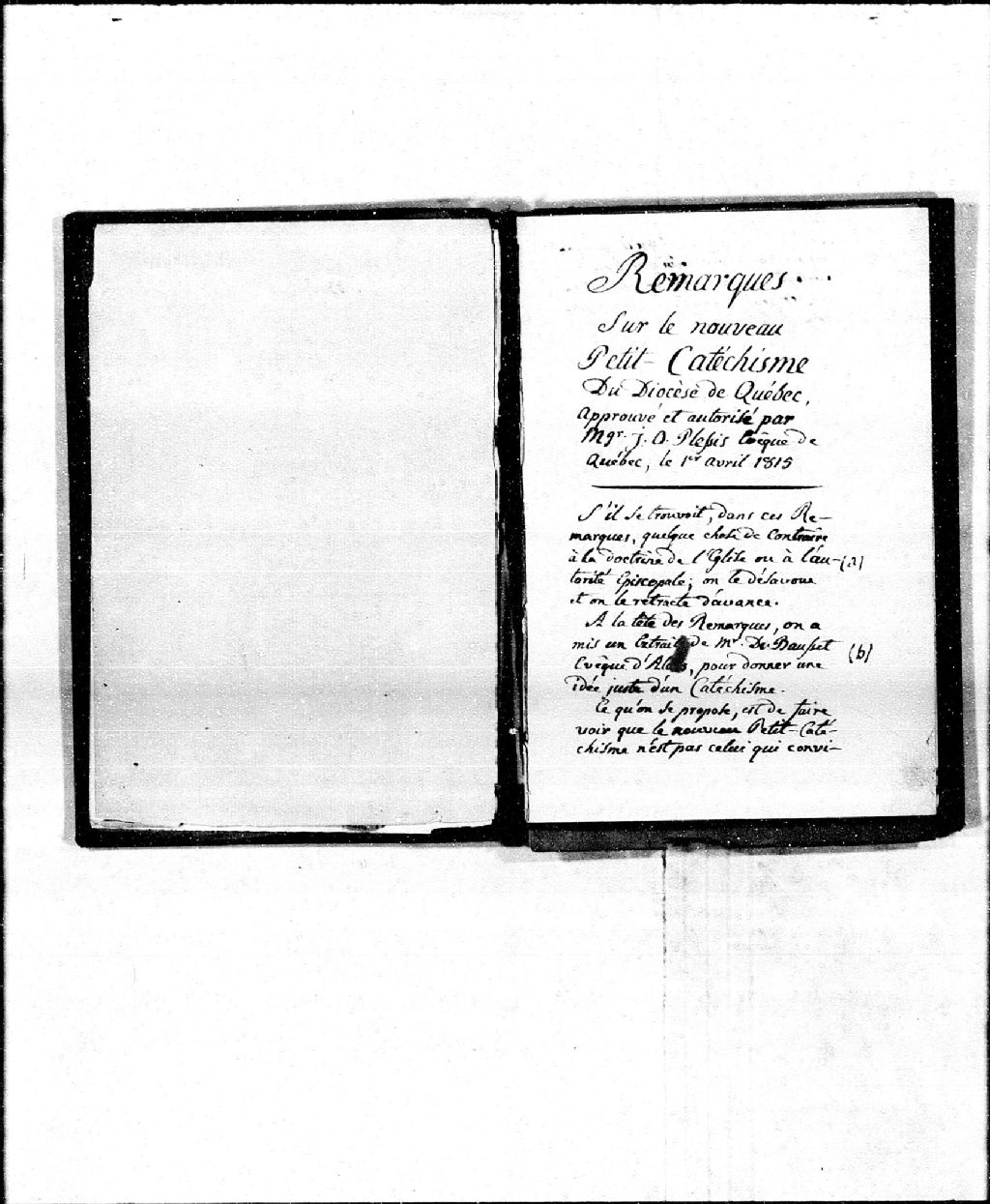 - Livre manuscrit intitulé «Remarques sur le nouveau petit catéchisme du diocèse de Québec», autorisé et approuvé par monseigneur J.-O. Plessis, évêque de Québec, 1er avril 1815; livres manuscrits intitulés «Notes pour sermons, retraites, etc.», 1857-1901