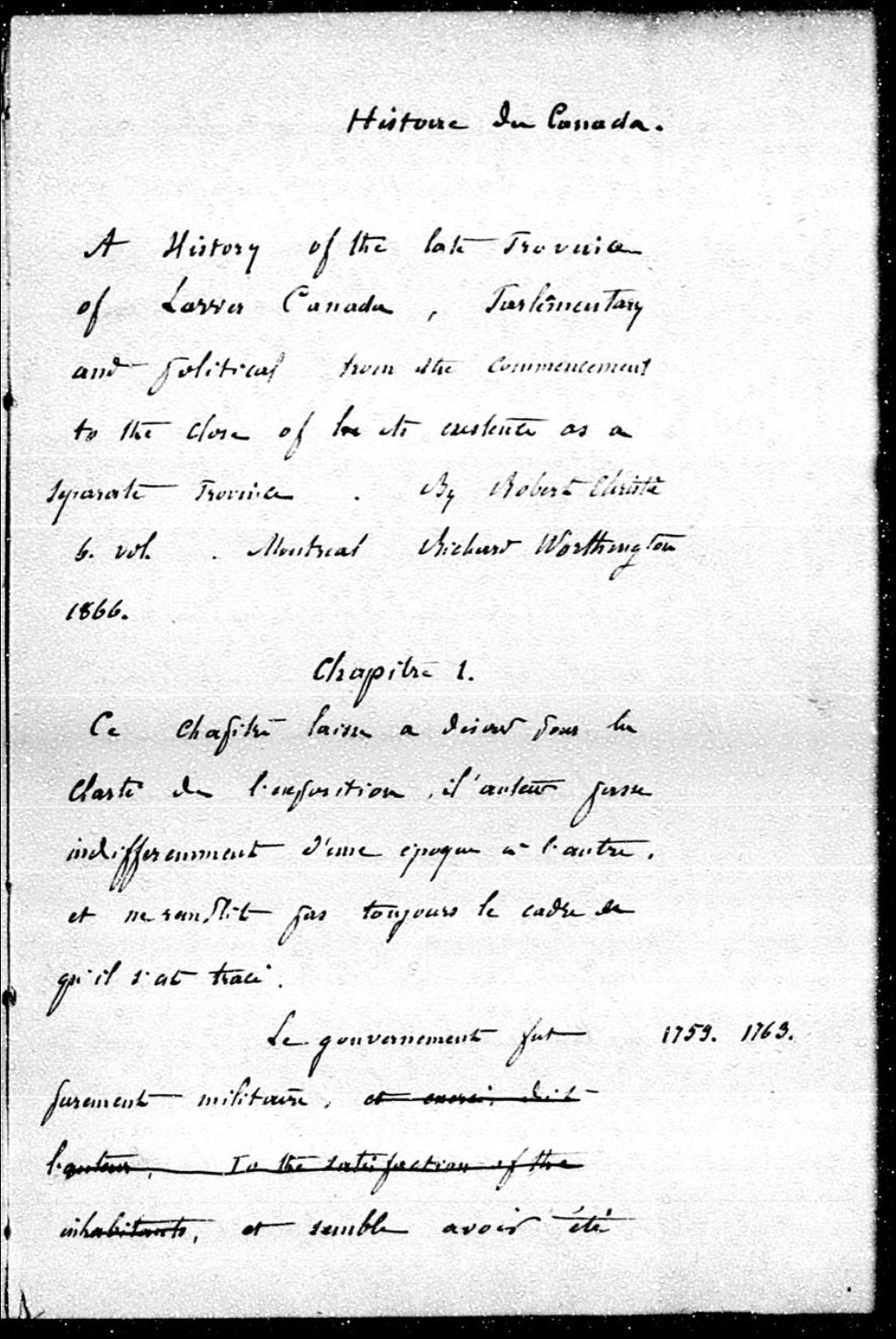 - Cahier manuscrit de notes sur l'histoire du Canada tirées de l'ouvrage de Robert Christie intitulé «A History of the Late Province of Lower Canada», Montréal, 1866; copie dactylographiée de l'Histoire du Canada, depuis l'année 1749 jusqu'à celle 176...; s.d