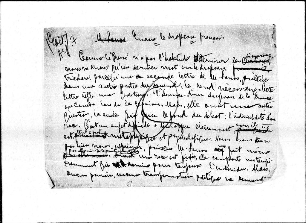 - Notes manuscrites et coupures de presse relatives à l'adoption du drapeau tricolore par les Canadiens français, 1er et 15 octobre 1910