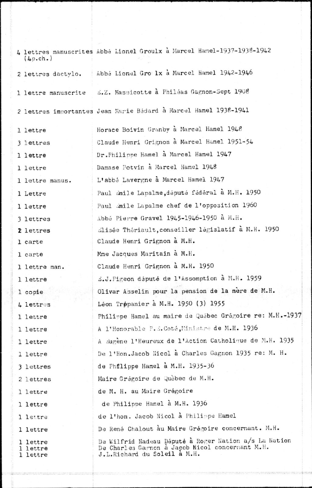 - Correspondance personnelle de monsieur Marcel Hamel, 10 juillet 1935 - 14 avril 1960. Parmi les principaux correspondants, nous retrouvons Roger Vézina, Louis Fréchette, le chanoine J.-A. Chamberland, Jean-Marie Parent, l'abbé Lionel Groulx, Philippe Hamel, J.-E. Grégoire, Olivar Asselin, Georges-Émile Lapalme, Claude-Henri Grignon et Horace Boivin