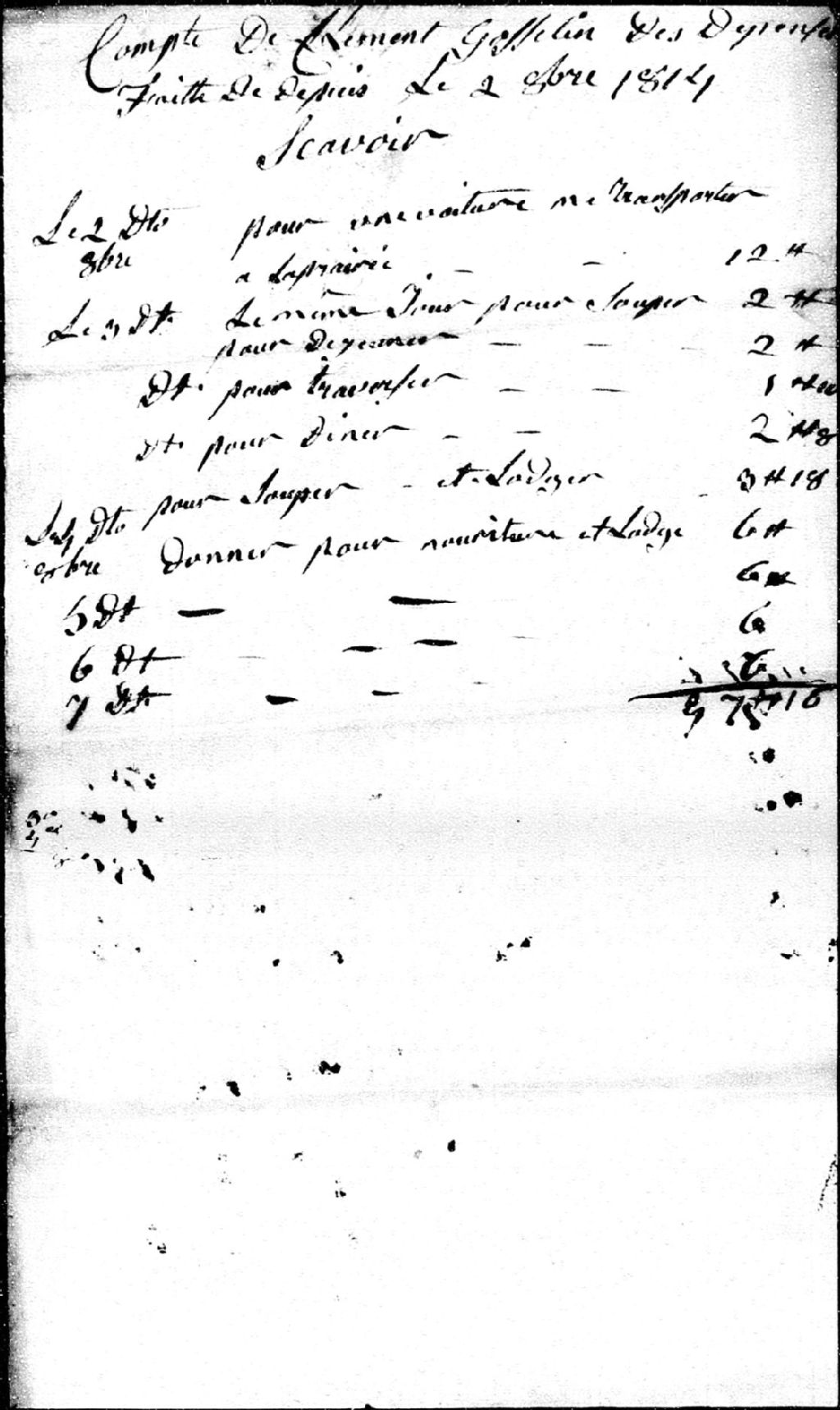Compte de dépenses personnelles de Clément Gosselin pour un voyage à Laprairie, 2 octobre 1814