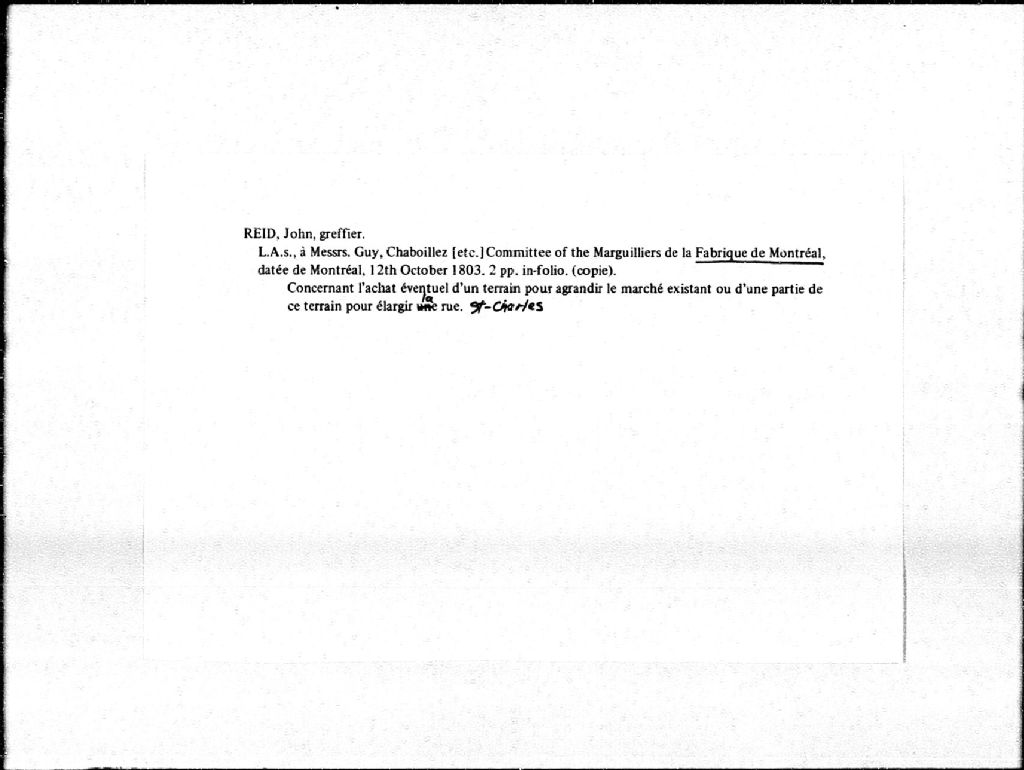 - Lettre du greffier John Reid au comité des marguilliers de la fabrique de Montréal concernant l'achat éventuel d'un terrain pour agrandir le marché existant ou l'achat d'une partie de ce terrain pour élargir la rue Saint-Charles, Montréal, 12 octobre 1803