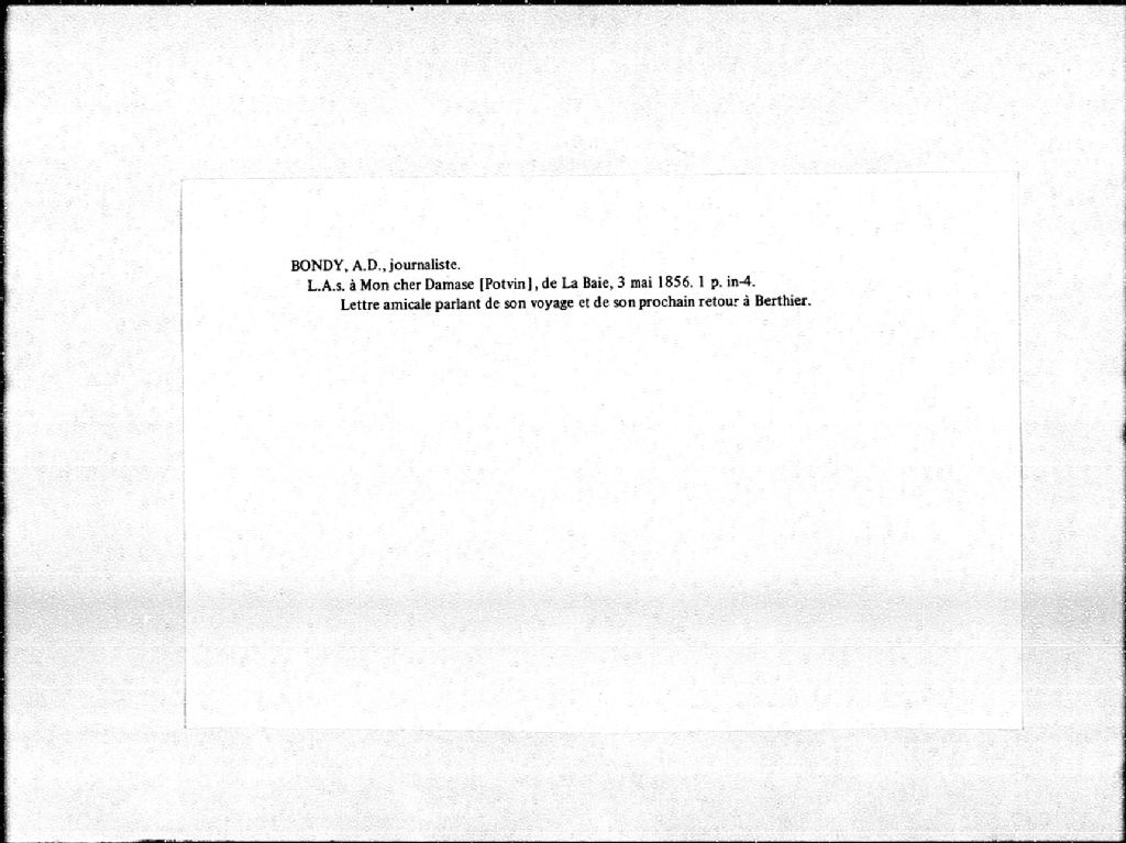 A.-D. Bondy (Les documents originaux de ce dossier ont été déposés en 2006 au Centre régional d'archives de Lanaudière à L’Assomption), 1856, Archives nationales à Montréal, Collection des petits fonds et collections d'archives manuscrites d'origine privée, (06M,P1000,D867).
