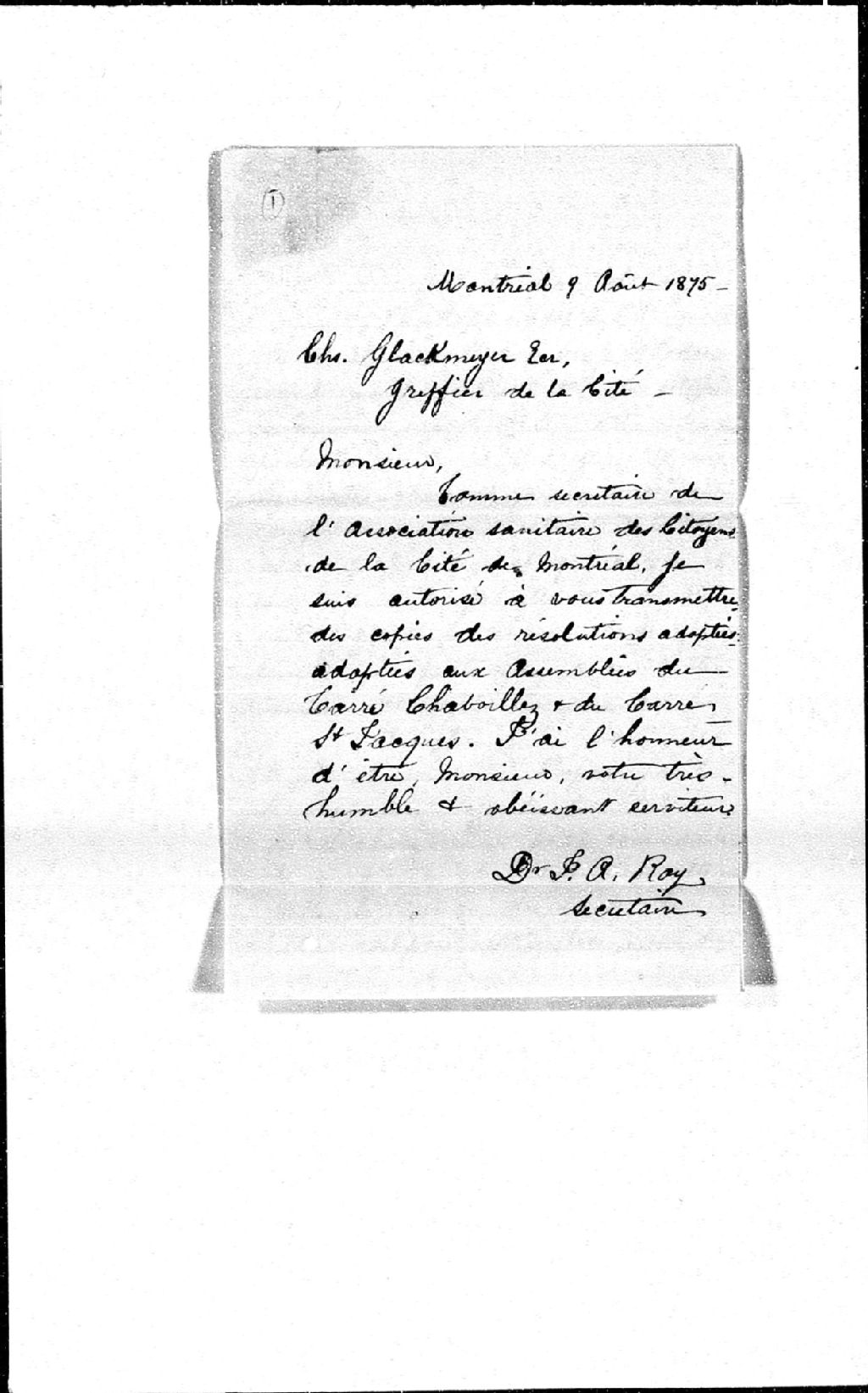 - Lettre de résolution et pétition de l'Association sanitaire des citoyens de Montréal s'opposant à la création d'un Bureau de santé et à la vaccination obligatoire, juillet - août 1875