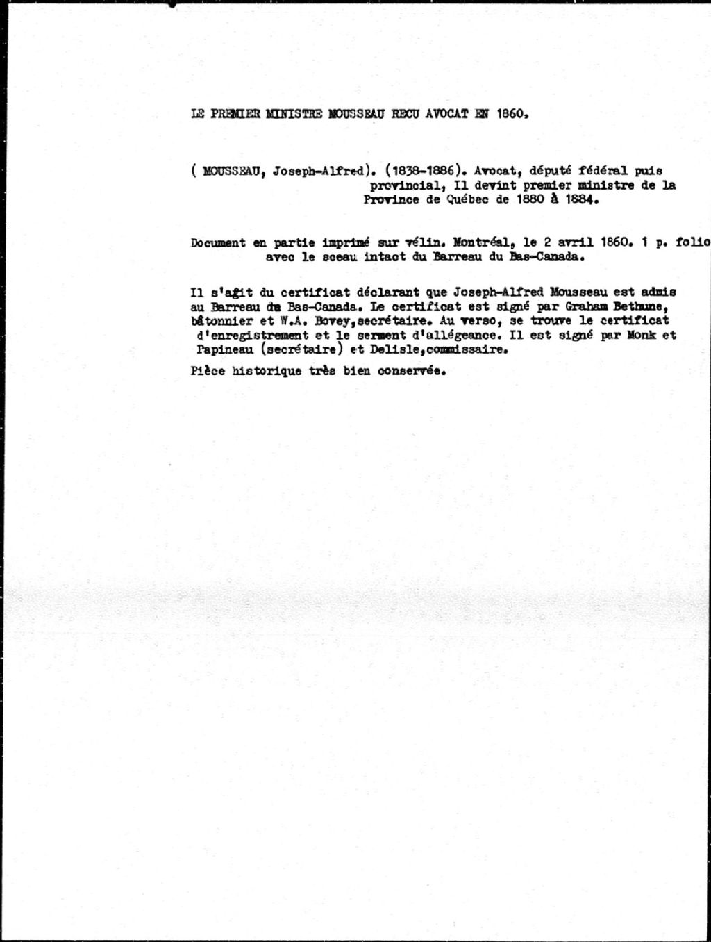 - Certificat déclarant que Joseph-Alfred Mousseau est admis au Barreau du Bas-Canada. Au verso, se trouve le certificat d'enregistrement et le serment d'allégeance, Montréal, avril 1860