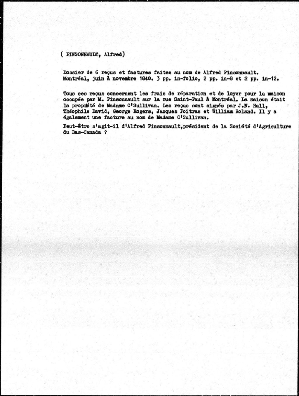 - Reçus concernant les frais de réparation et de loyer de la maison occupée par Alfred Pinsonneault sur la rue Saint-Paul, à Montréal, juin - novembre 1840