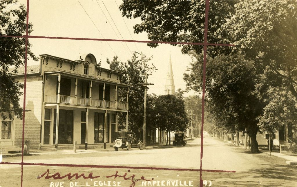 Rue de l'Église à Napierville, [1930], Archives nationales à Montréal, Collection Félix Barrière, (06M,P748,S1,P2932), Barrière, Félix.