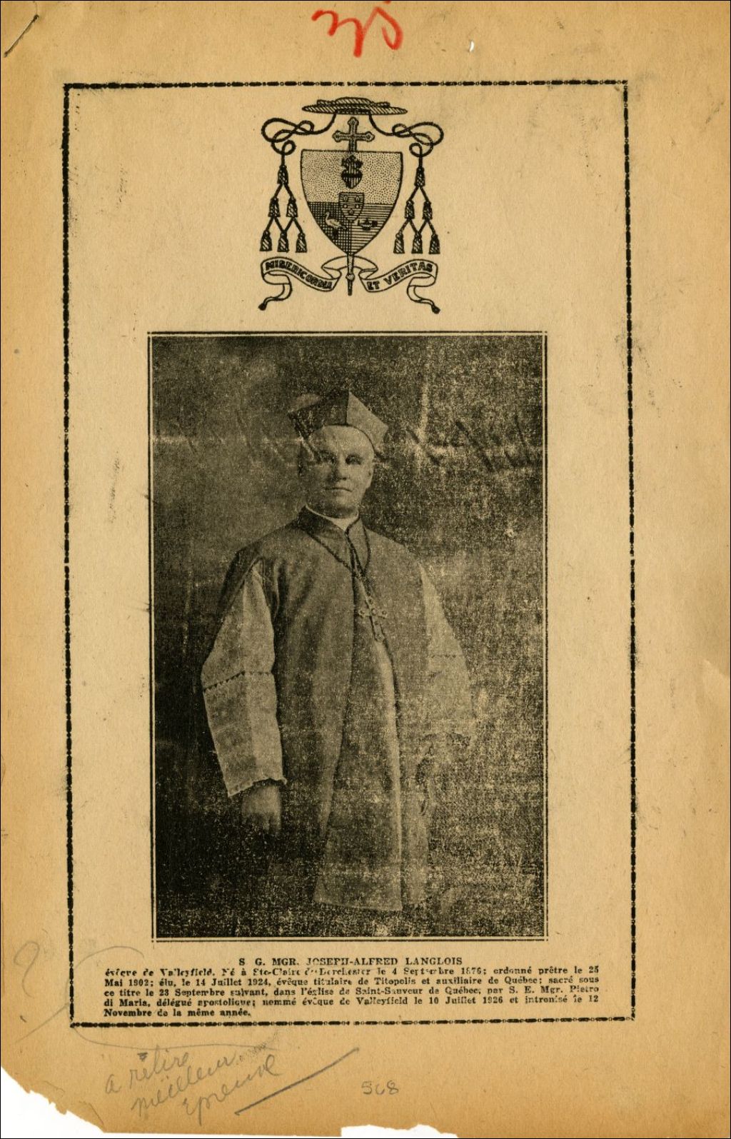 Joseph Alfred Langlois, évêque de Valleyfield, [Vers 1920], Archives nationales à Montréal, Collection Félix Barrière, (06M,P748,S1,P568), Barrière, Félix.
