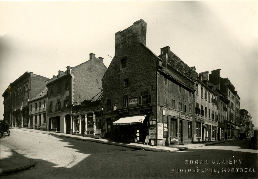 La photographie montre aussi les maisons en pierre sur les rues Bonsecours et Saint-Paul à Montréal. La devanture de la maison du Calvet est placardée d'annonces publicitaires