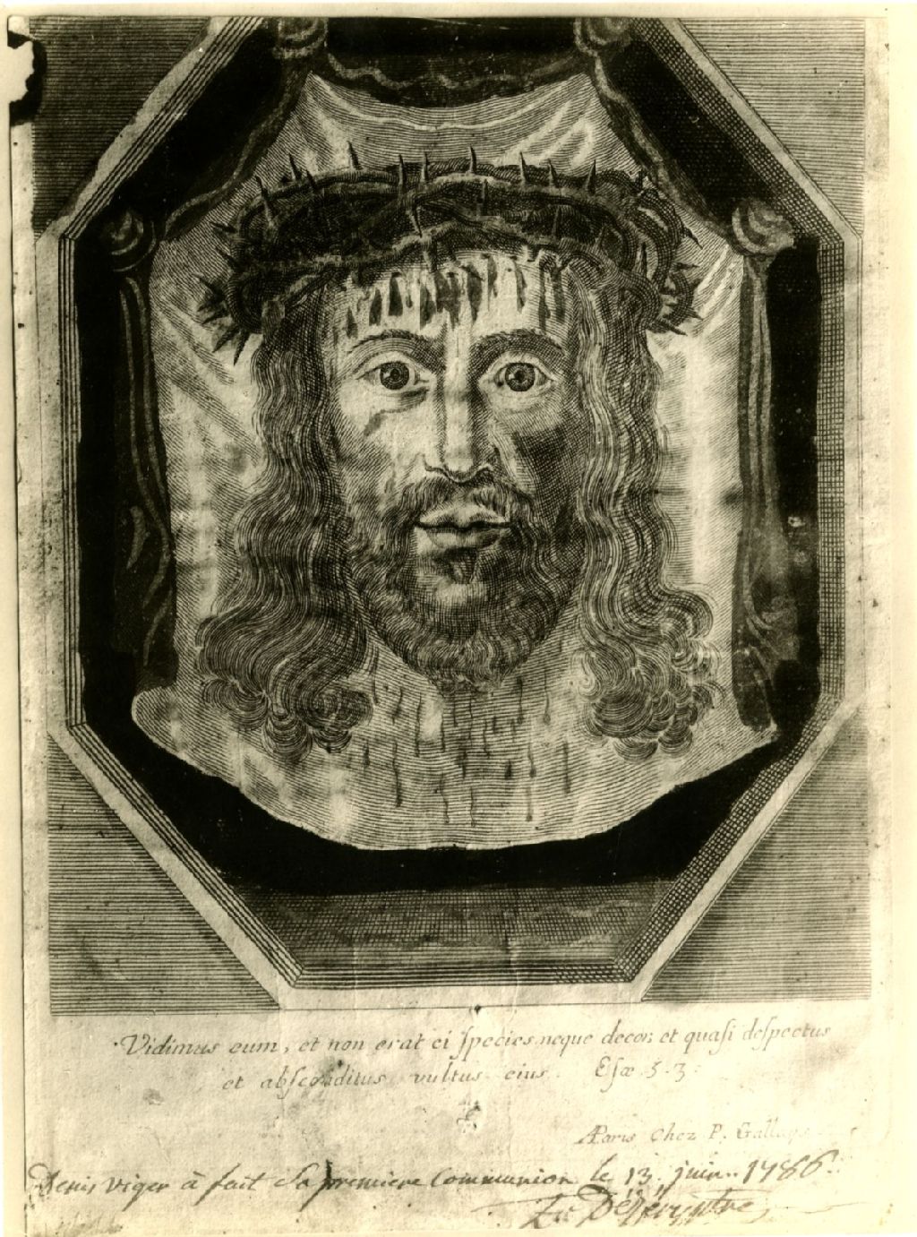 En bas de la gravure est imprimé une citation latine de la Bible. "Vidimus eum, et non erat ei species neque decor, et quasi despectus et asbsconditus vultus eius. Esoe. 5.3.Note au verso du document : «Portrait peint à la main». Une note en bas indique : «Denis Viger a fait sa première communion le 13 juin 1786, signé dL. Dézery, ptre»