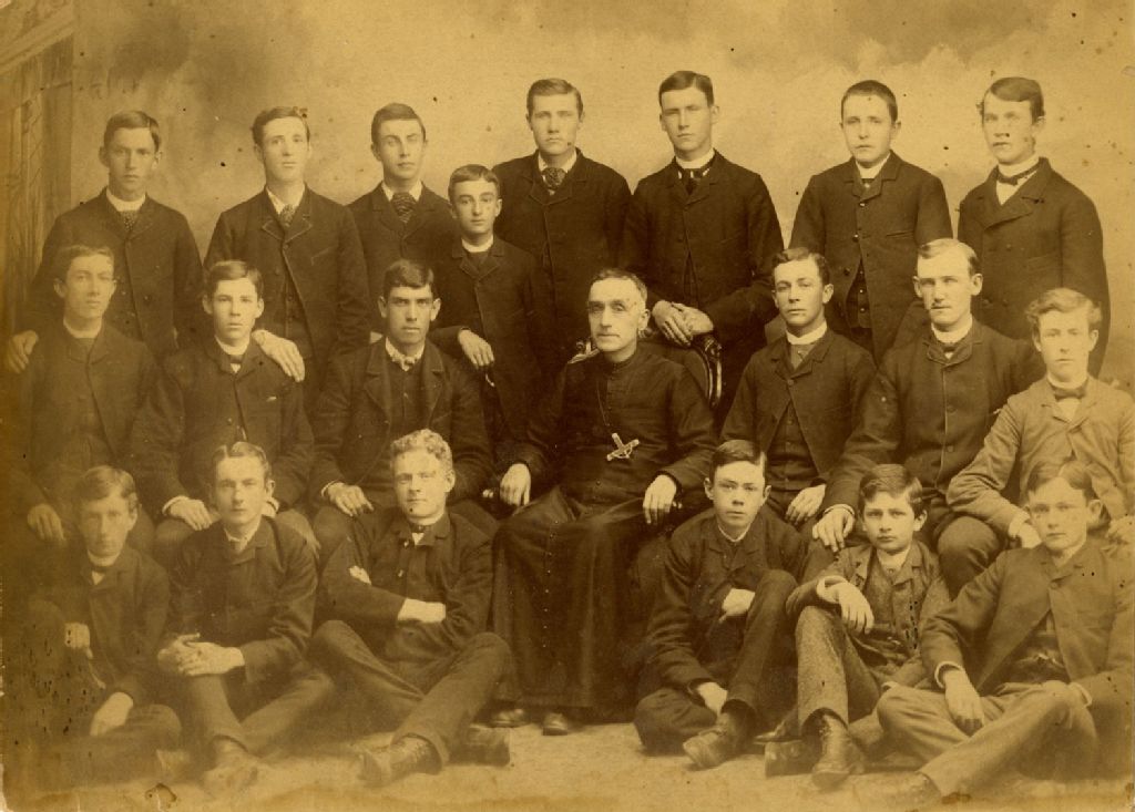 Groupe de collégiens en compagnie de leur professeur, [Vers 1883], Archives nationales à Montréal, Fonds Famille Landry, (06M,P155,S1,SS1,D102), Photographe non identifié.