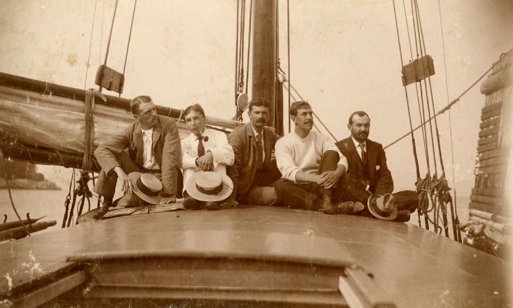 Aimé Geoffrion, Doucet, Joseph Philippe Landry, Edward Amos et Monongahela de Beaujeu à bord de la "Bernadette" à Vaudreuil, 22 août 1894, Archives nationales à Montréal, Fonds Famille Landry, (06M,P155,S1,SS1,D221), Photographe non identifié.