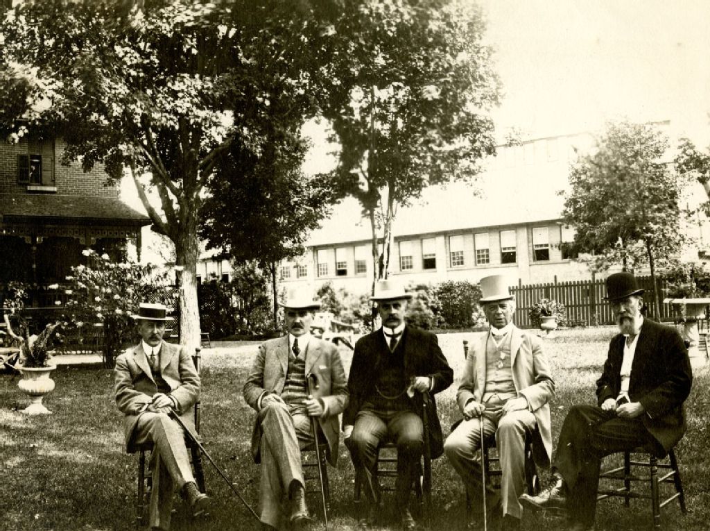 Ce dossier montre des hommes assis dans une cour extérieure dont entre autre, en partant de la droite, Isidore Belleau, Wilfrid Laurier, Robert-Laird Borden