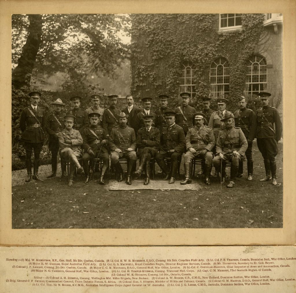 Ce dossier comprend une photographie de groupes d'officiers du Canada, de l'Australie, de la Nouvelle-Zélande, de l'Angleterre et de l'Afrique du Sud. Ceux en position debout sont, en partant de la gauche : W. Robertson, E.W.B. Morrison, P.E. Thacker, H.W. Dangar, G.S. Maunsell, Mr. Hofmeyer, J.P. Landry, C.C.M. Maynard, C. Greville-Hartson, N.G. Cameron, H. Temple-Mursell, C.M. Merritt et W.E. Hodgins. En position assise : A.H. Russell, A.W. Robins, C.F. Beyers, Honorable Sam Hughes, G.M. Harper, Honorable Sir N. Moore et J.G. Legge
