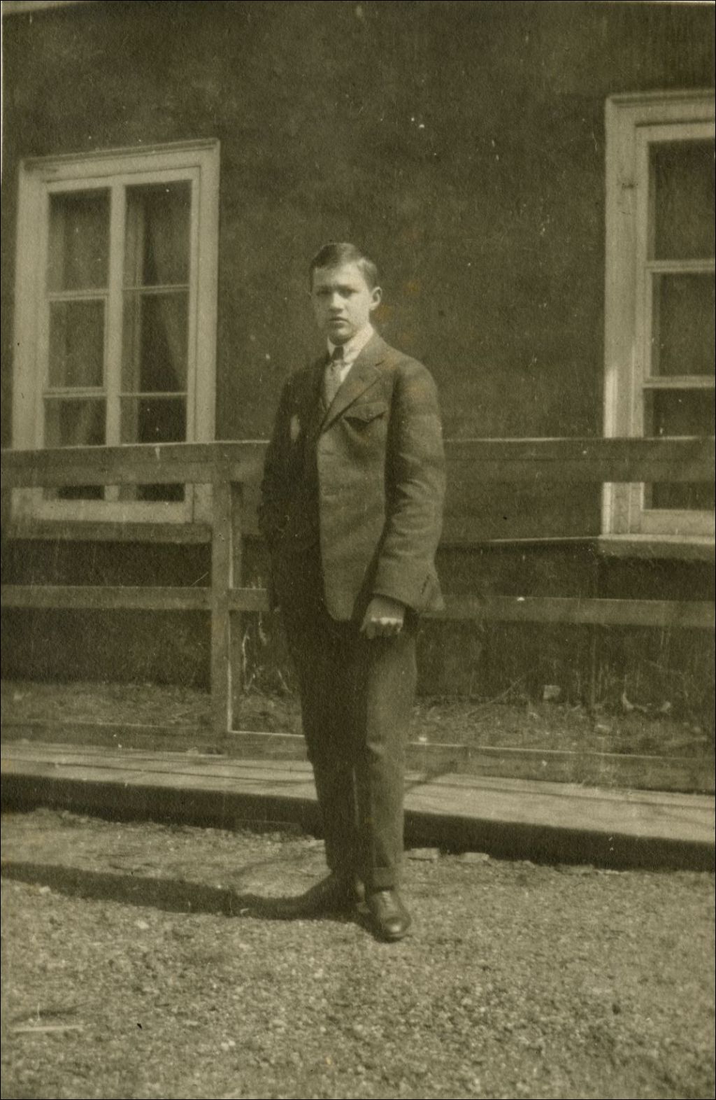 Jules Landry devant un édifice bordé d'un trottoir de bois