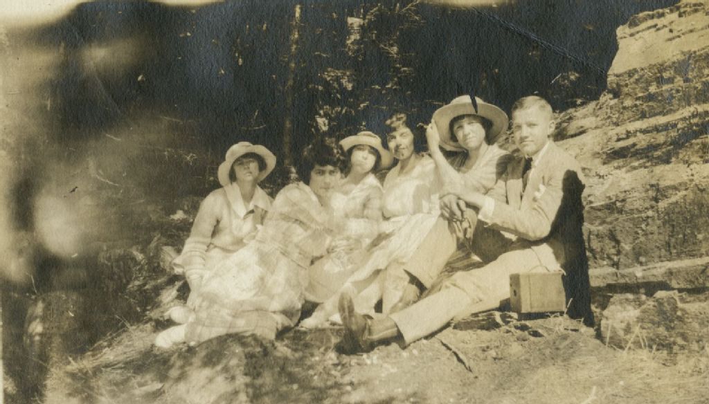 Jules Landry (P1) en compagnie d'autres jeunes gens au cap Taché, à Saint-Germain, dans le Bas-Saint-Laurent, 1920, Archives nationales à Montréal, Fonds Famille Landry, (06M,P155,S1,SS1,D456), Photographe non identifié.