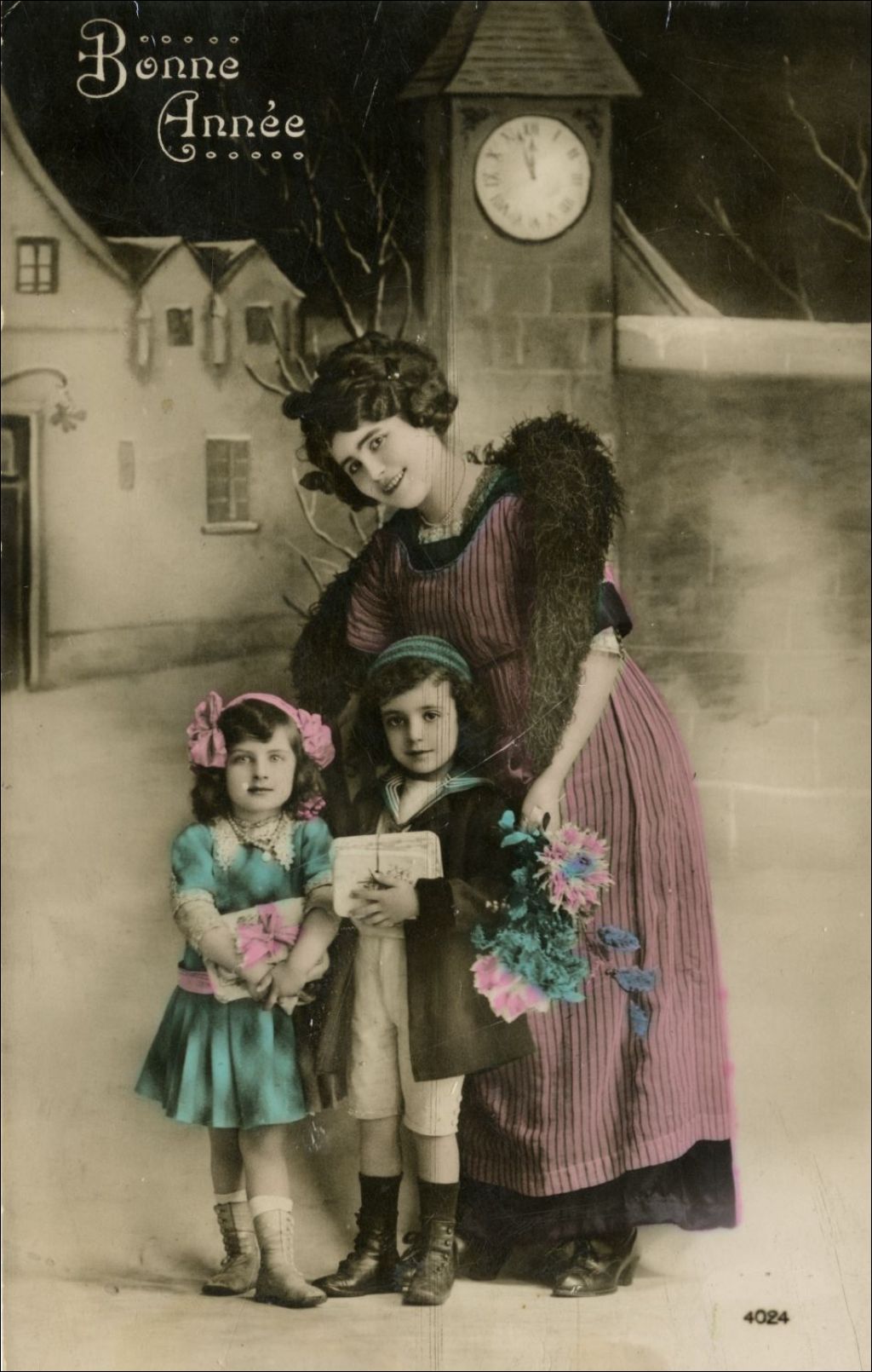 Femme avec une fillette et un garçonnet tenant des étrennes