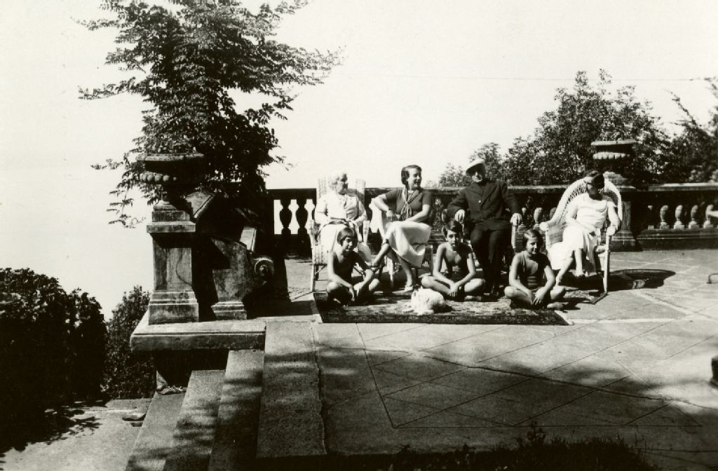 Groupe de personnes sur une terrasse de la Villa Maryland au lac de Genève