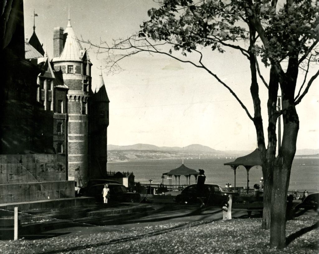 Vue du Château Frontenac et de la terrasse avec à l'arrière-plan le pont de l'île d'Orléans, [Vers 1940], Archives nationales à Montréal, Fonds Famille Landry, (06M,P155,S1,SS1,D634), Photographe non identifié.