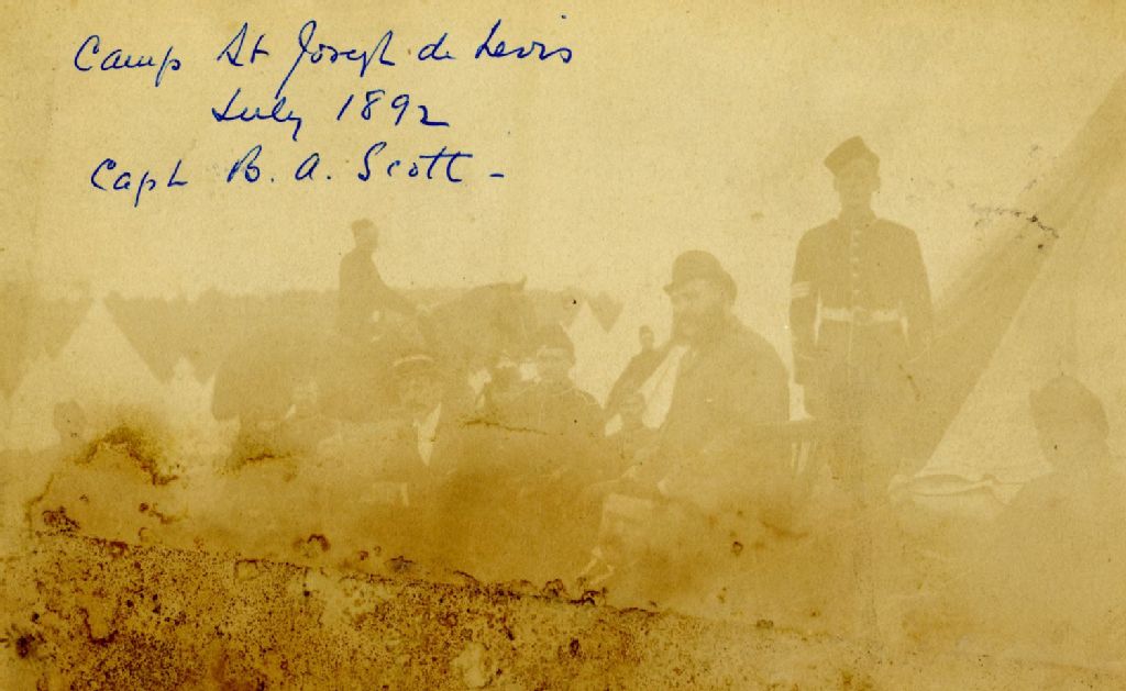 Ce dossier regroupe sur deux cartons des photographies du lieutenant-colonel Philippe Landry parmi des militaires en camp(s) d'entraînement annuel(s) à Saint-Joseph de Lévis. L'une d'entre elles identifie le capitaine B.A. Scott au camp de juillet 1892