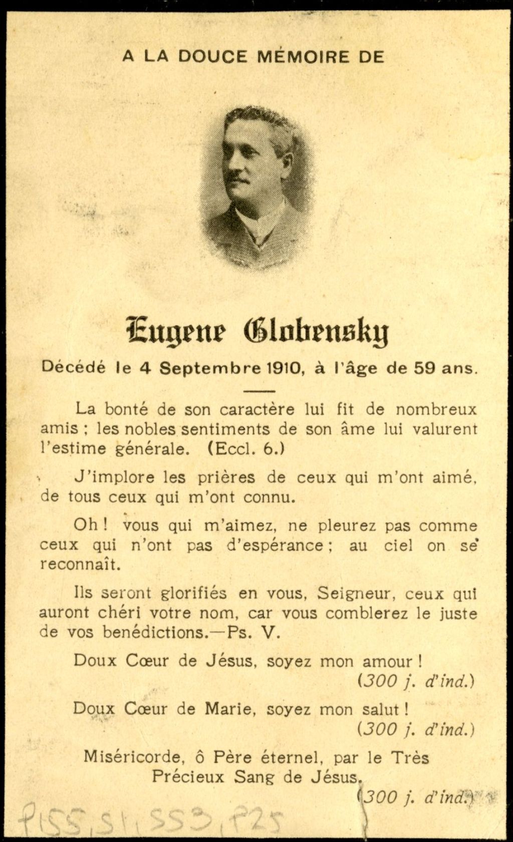 À la douce mémoire de Eugène Globensky décédé le 4 septembre 1910, à l'âge de 59 ans, [1910], Archives nationales à Montréal, Fonds Famille Landry, (06M,P155,S1,SS3,P25), Photographe non identifié.