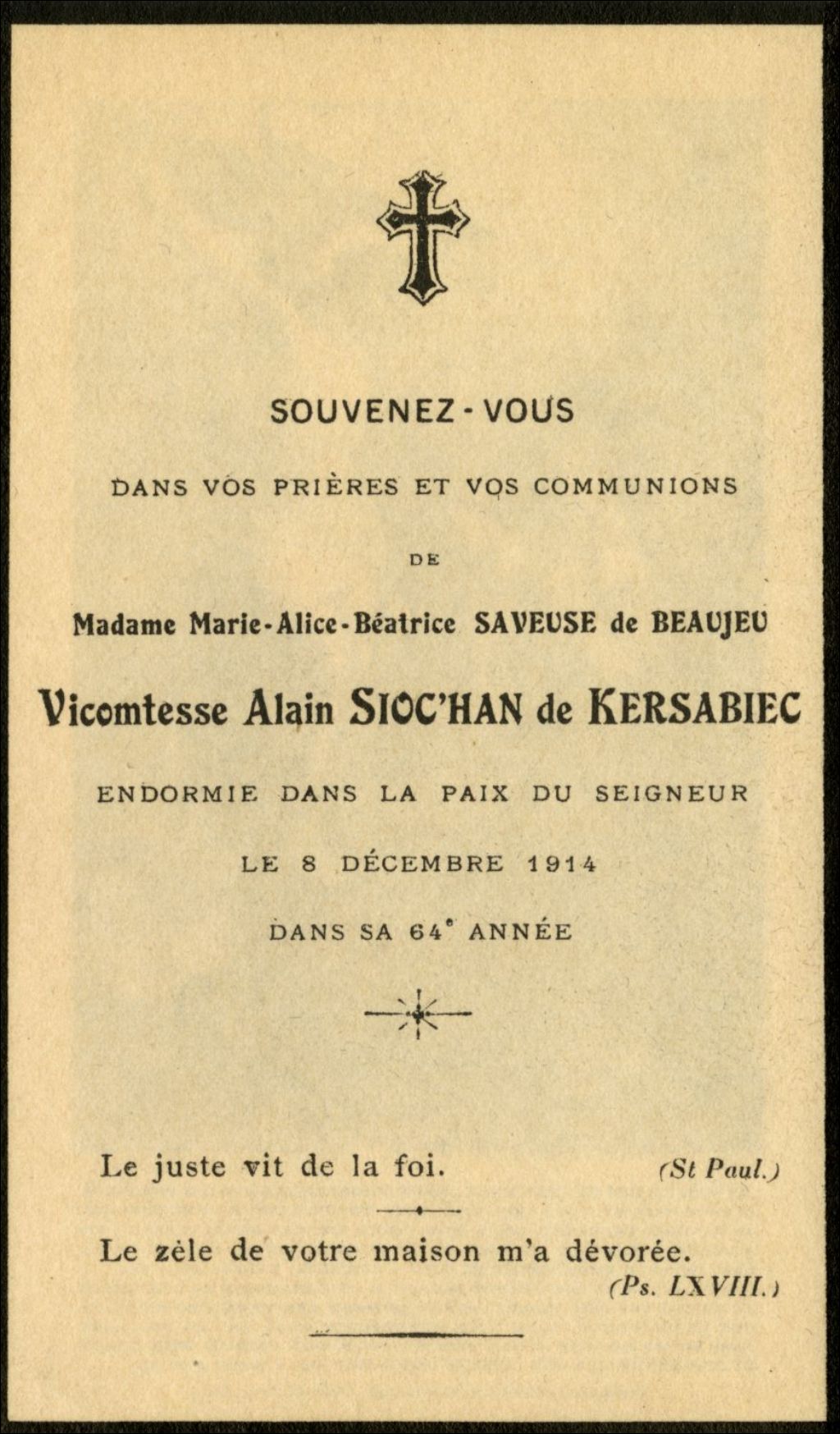 Souvenez-vous dans vos prières et vos communions de Madame Marie-Alice-Béatrice Saveuse de Beaujeu, Vicomtesse Alain Sioc'Han de Kersabiec endormie dans la paix du Seigneur le 8 décembre 1914 dans sa 64e année