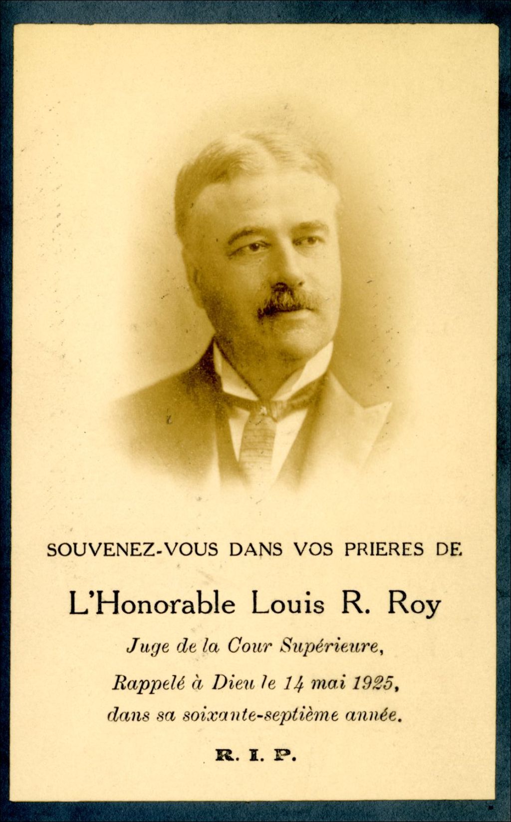 Souvenez-vous dans vos prières de l'Honorable Louis R[odolphe] Roy, juge de la Cour supérieure, rappelé à Dieu le 14 mai 1925, dans sa soixante-septième année, [1925], Archives nationales à Montréal, Fonds Famille Landry, (06M,P155,S1,SS3,P45), J.E. Livernois.